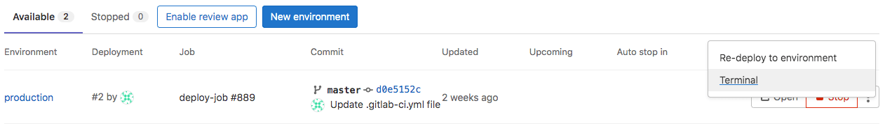 stages: - build - test - deploy ... deploy_review: stage: deploy environment: name: review/$CI_COMMIT_REF_SLUG url: https://$CI_ENVIRONMENT_SLUG.example.com on_stop: stop_review stop_review: stage: deploy environment: name: review/$CI_COMMIT_REF_SLUG action: stop when: manual -