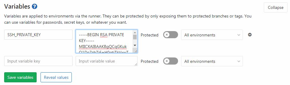 We'll use this variable in the .gitlab-ci.yml later, to easily connect to our remote server as the deployer user without entering its password.