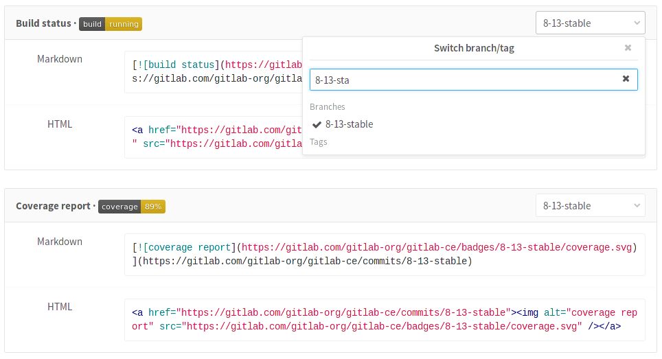 Pipeline badges indicate the pipeline status and a test coverage value for your project. These badges are determined by the latest successful pipeline.
