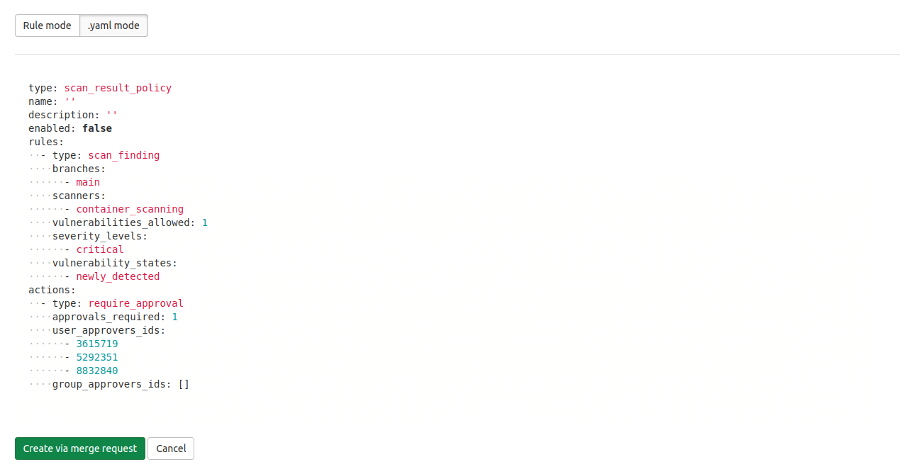 When you finish creating or editing your policy, save and apply it by selecting the Configure with a merge request button and then merging the resulting merge request. When you press this button, the policy YAML is validated and any resulting errors are displayed. Additionally, if you are a project owner and a security policy project has not been previously associated with this project, then a new project is created and associated automatically at the same time that the first policy merge request is created.