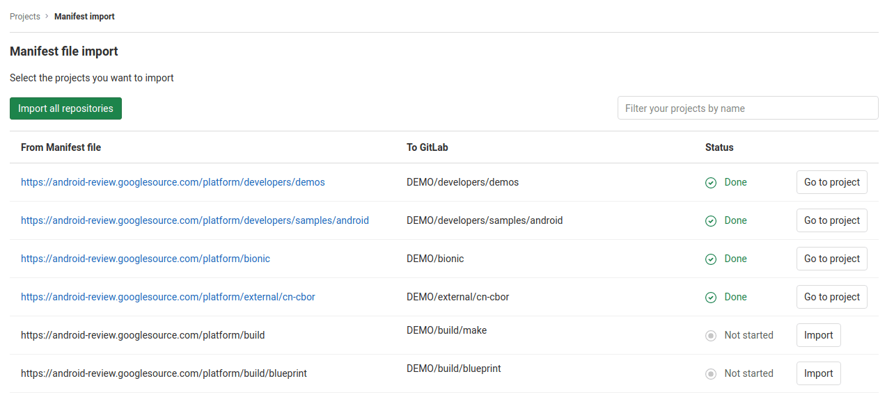 GitLab allows you to import all the required Git repositories based on a manifest file like the one used by the Android repository. Use the manifest to import a project with many repositories like the Android Open Source Project (AOSP).