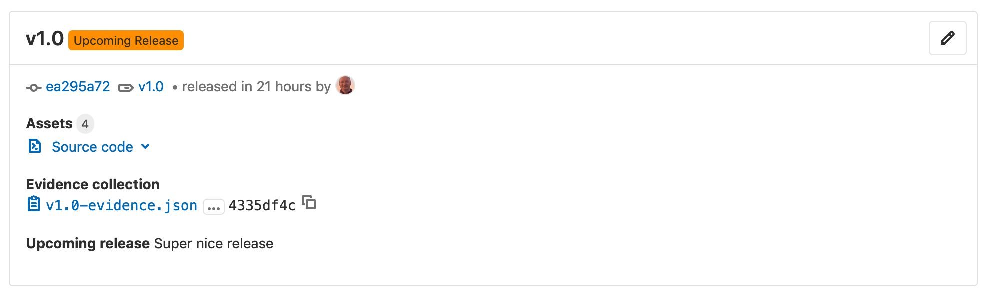- GitLab automatically creates a JSON file that lists everything in the release, so you can compare and audit releases. This file is called release evidence.
